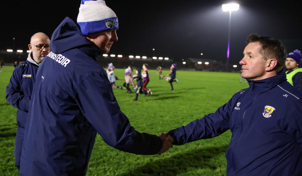 Laois manager and SDLP MLA for Newry & Armagh Justin McNulty, shakes hands with Wexford Mayor & manager Cllr John Hegarty at Wexford Park. Pic: Sportsfile