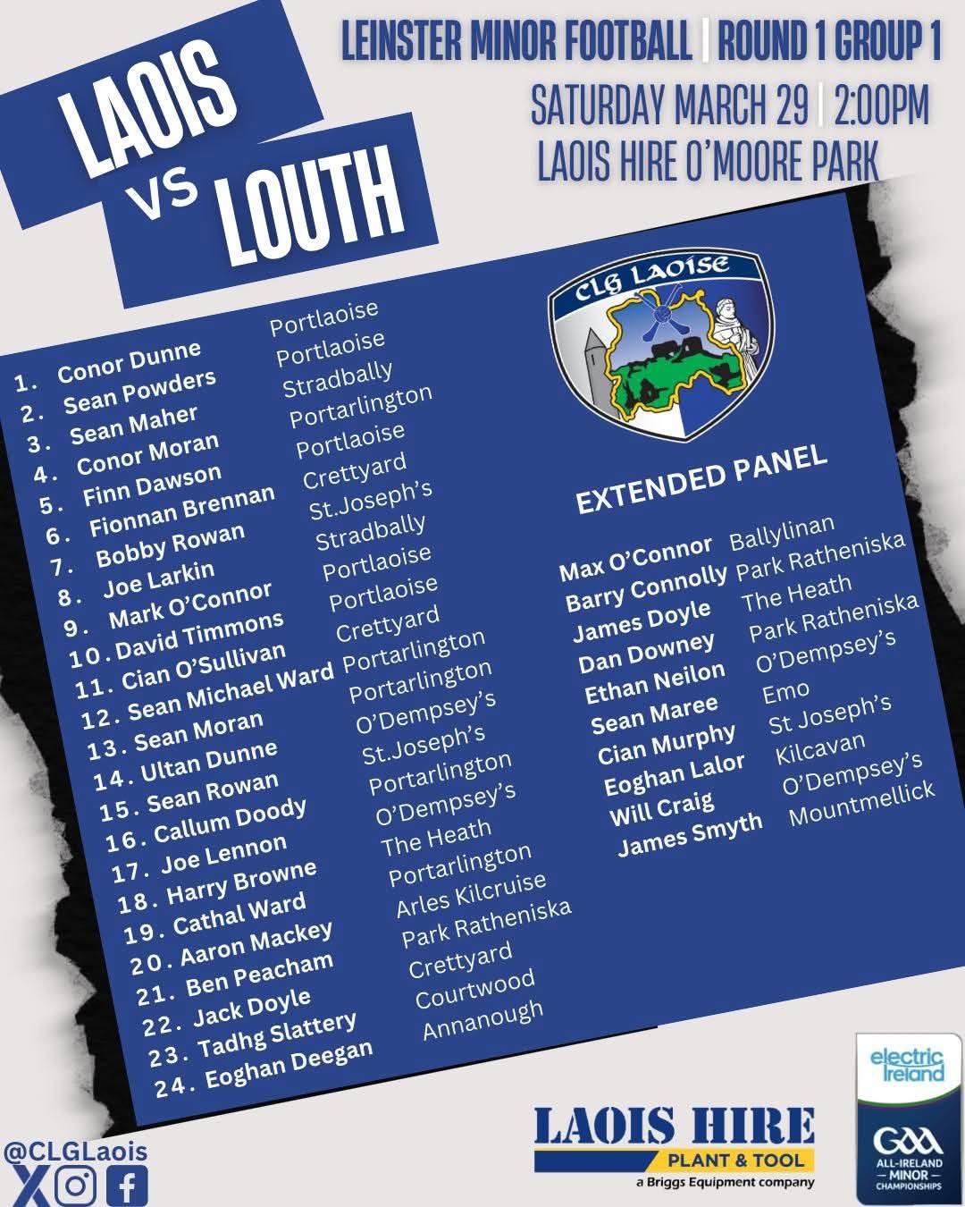 Laois Minor Football manager John Larkin has revealed his starting 15 and substitutes for Saturday afternoon's opening game in the Leinster Championship against Louth. He has also named who'll captain the side and his vice-captains.