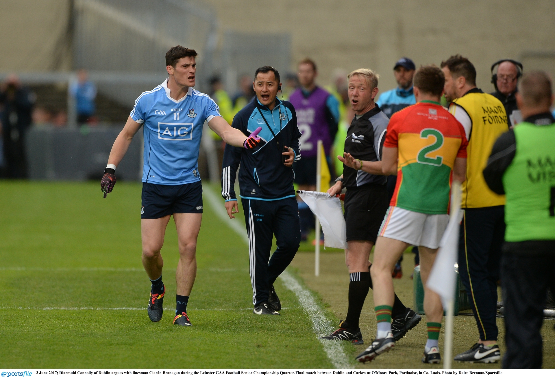 Diarmuid Connolly of Dublin argues with linesman Ciarán Branagan during the 2017 Leinster GAA Football Senior Championship Quarter-Final match between Dublin and Carlow at O'Moore Park, Portlaoise. Photo by Daire Brennan/Sportsfile