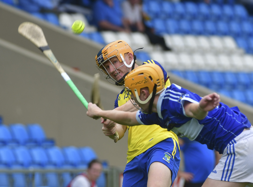 Colin Byrne, Abbeyleix, points this sliotar with Rory Kelly, Castletown looks to block.