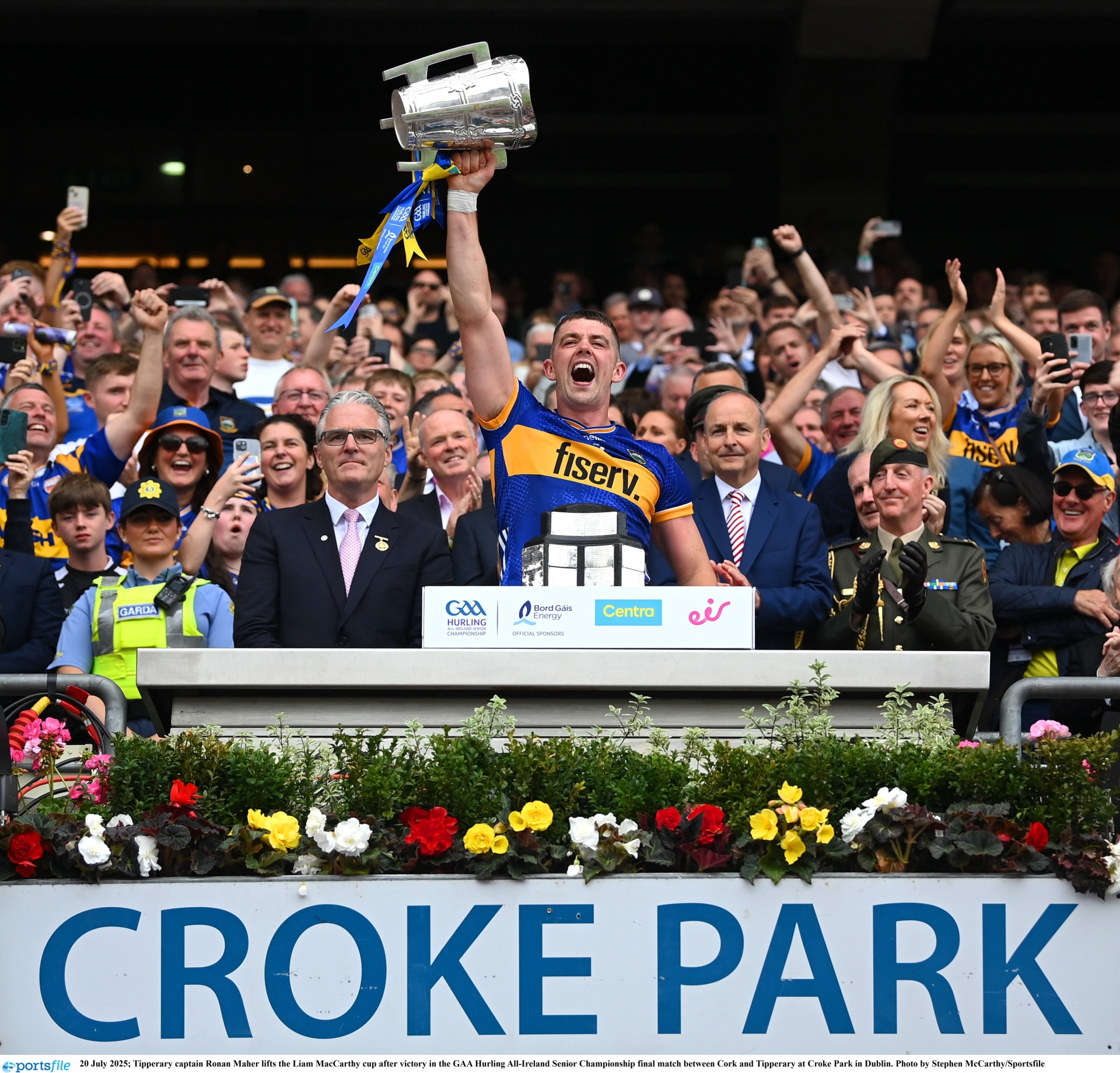 Portlaoise-based Garda Ronan Maher lifts the Liam McCarthy after leading Tipperary to the 2025 All-Ireland title. Pic: Sporstsfile
