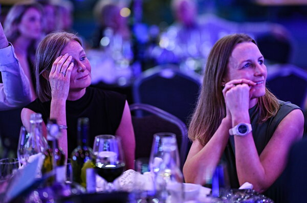 Hall of Fame award recipient Mary Casey from the Timahoe club in Laois, left, and her sister Angela Casey react to a video montage during the 2025 LGFA National Volunteer of the Year awards ceremony, in association with Dooctor.ie, at Croke Park Stadium in Dublin. Photo by Sam Barnes/Sportsfile