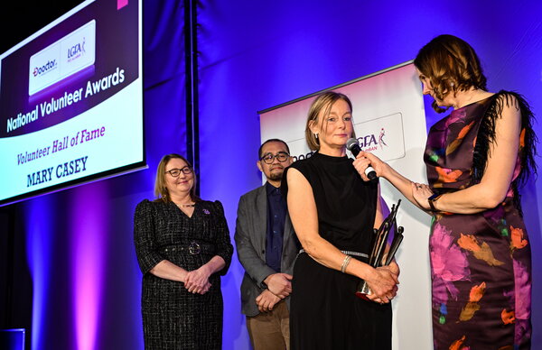 Hall of Fame award recipient Mary Casey from the Timahoe club in Laois, second from right, is interviewed by MC Gráinne McElwain during the 2025 LGFA National Volunteer of the Year awards ceremony, in association with Dooctor.ie, at Croke Park Stadium in Dublin. Photo by Sam Barnes/Sportsfile
