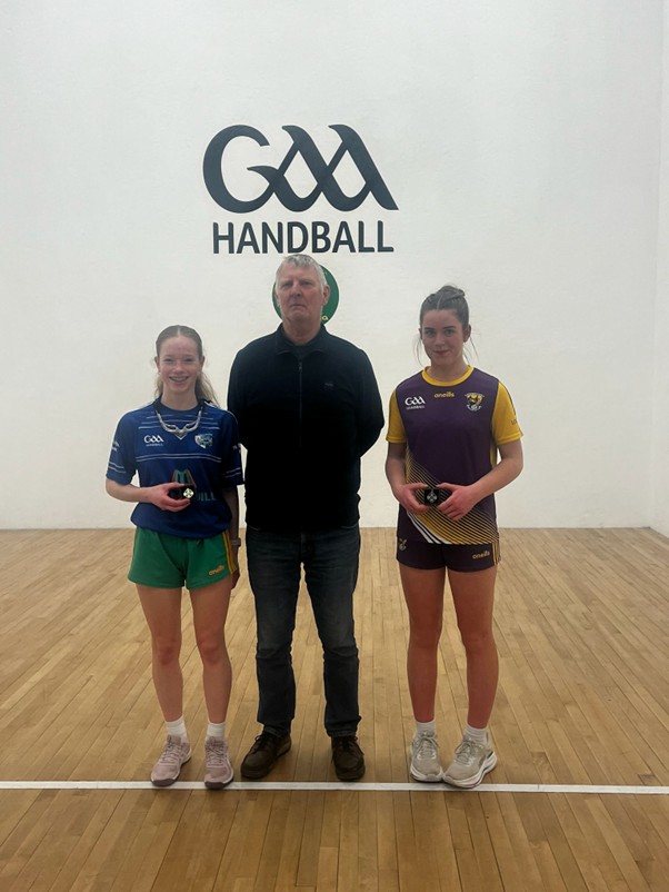 2026 Girls U-17 Leinster 40x20 Singles Finalists: Annie Grant (Laois) & Ruth Hassey (Wexford) being presented with their medals by Leinster GAA Handball delegate Billy Love