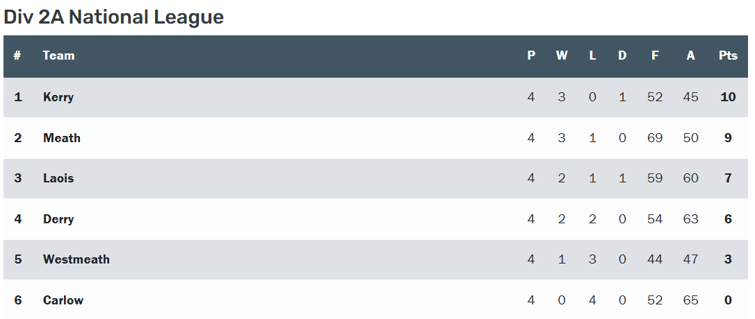 Currently third in the table on seven points, Laois can still reach the league final if they beat Westmeath and results elsewhere go their way. Meath sit second with nine points and face an already relegated Carlow, while top-of-the-table Kerry travel to Derry. SEE THE LEAGUE TABLE BELOW.