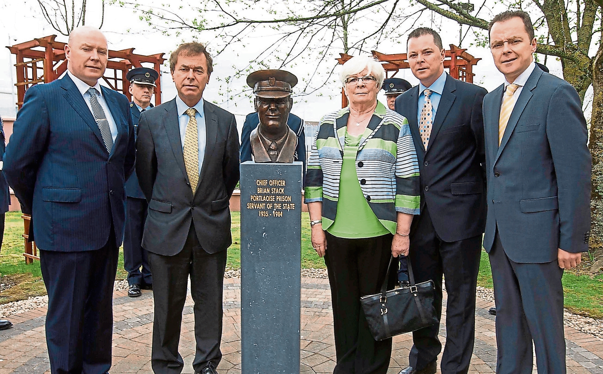 Sheila Stack wife of the late Chief Officer Brian Stack with the bronze bust after being unveiled at the Prison Service College, Portlaoise by Minister for Justice Equality and Defence Alan Shatter TD in 2013 with Austin, Oliver and Kieran Stack. Picture: Alf Harvey/hrphoto.ie