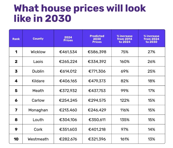 The property survey said Wicklow is forecasted to experience the steepest rise in house prices by 2030, with an average increase of 27%. Property prices are set to climb from €461,534 to €586,398, continuing the county's trend of significant growth—house prices in Wicklow have already risen by 75% over the past decade.