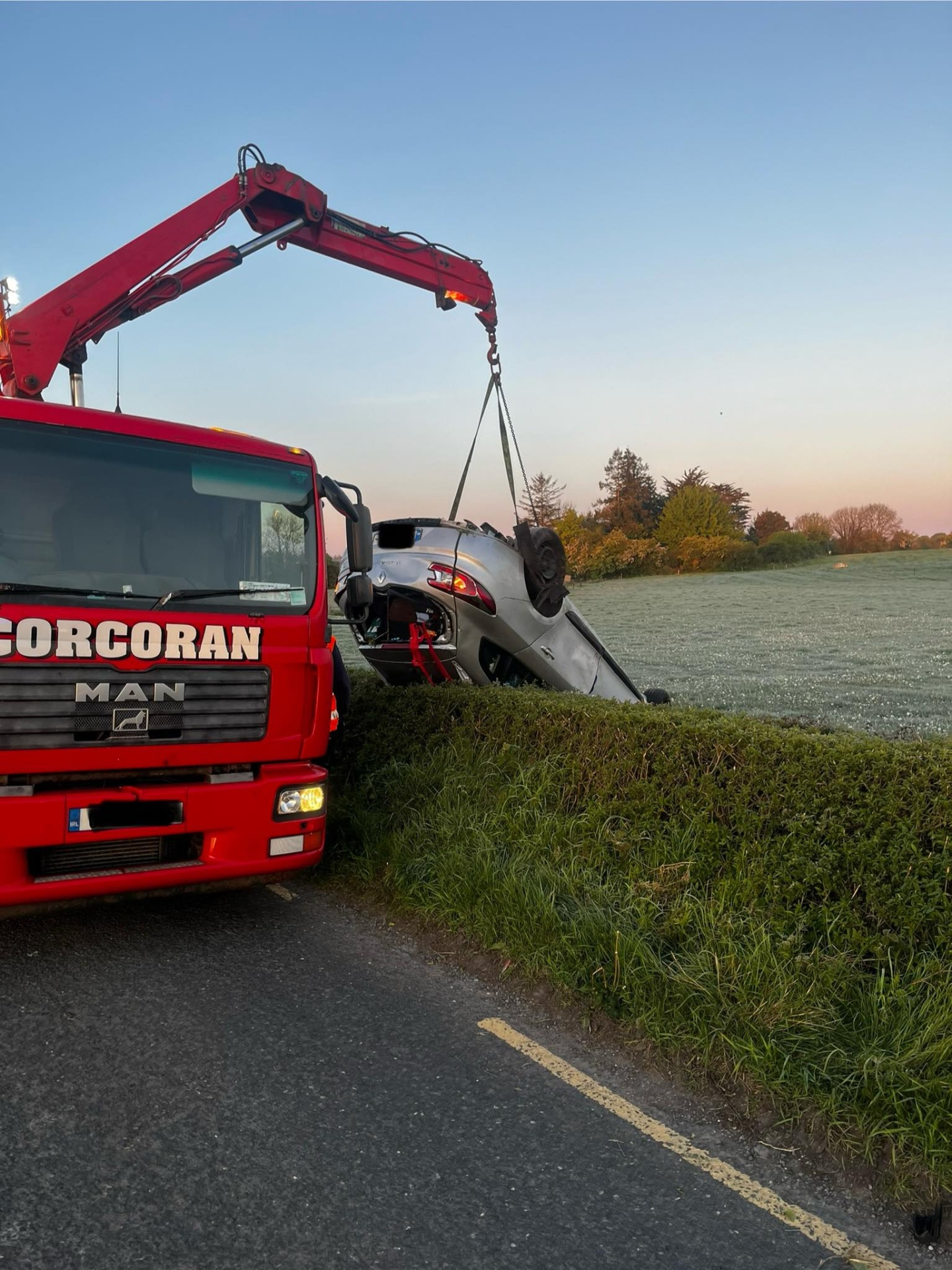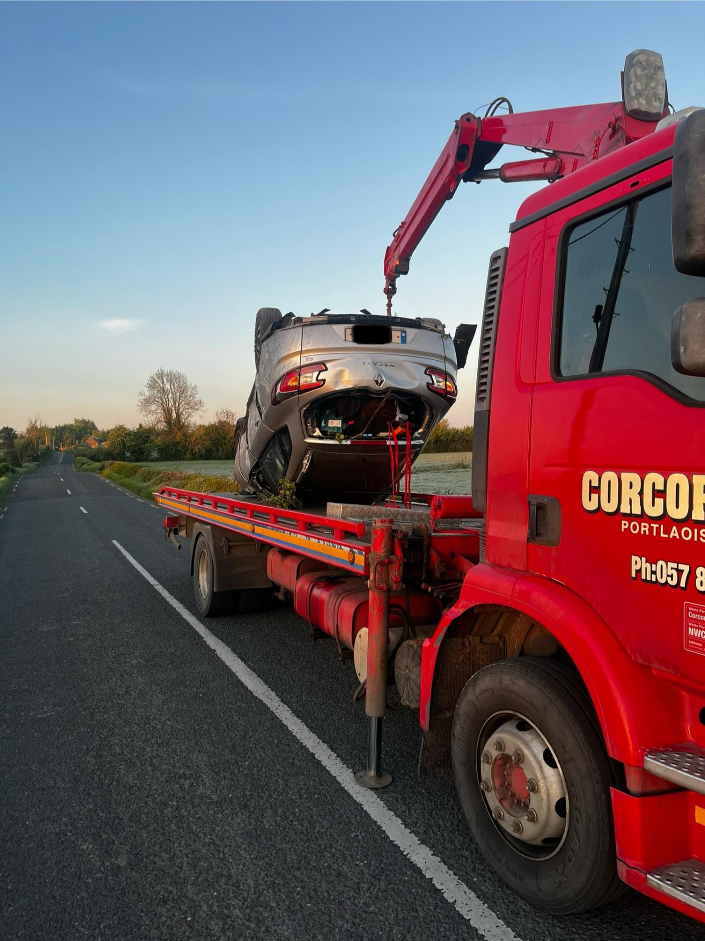 They said gardaí from Abbeyleix and Rathdowney dealt with the incident. A tow truck was deployed to remove the car which had landed on its roof from a field.