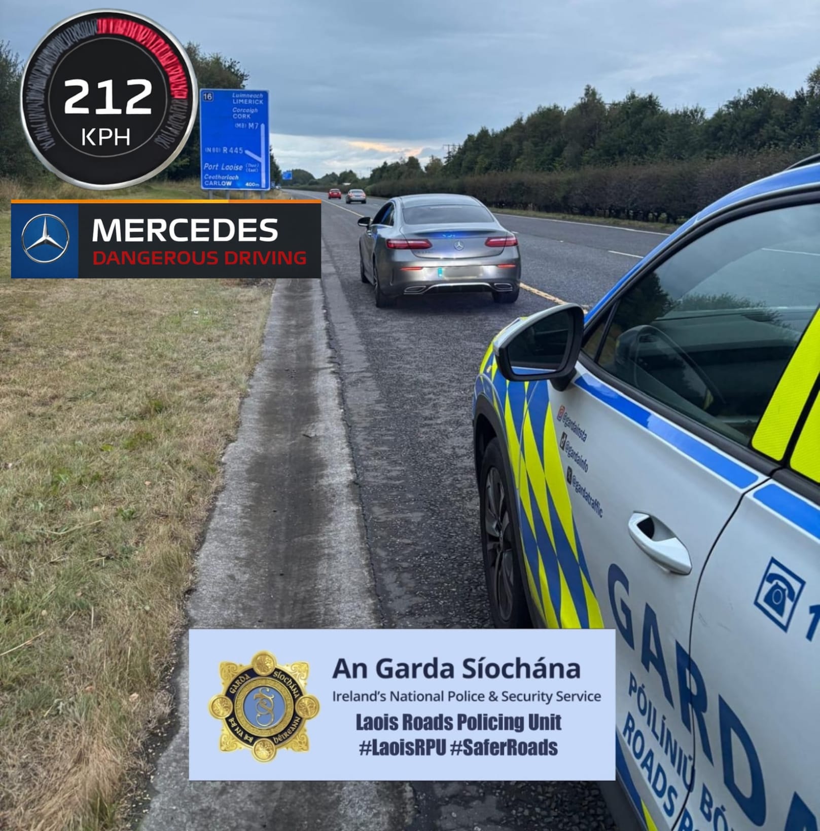 “Laois Roads Policing Unit detected a Mercedes at 212kph on the M7 yesterday evening.