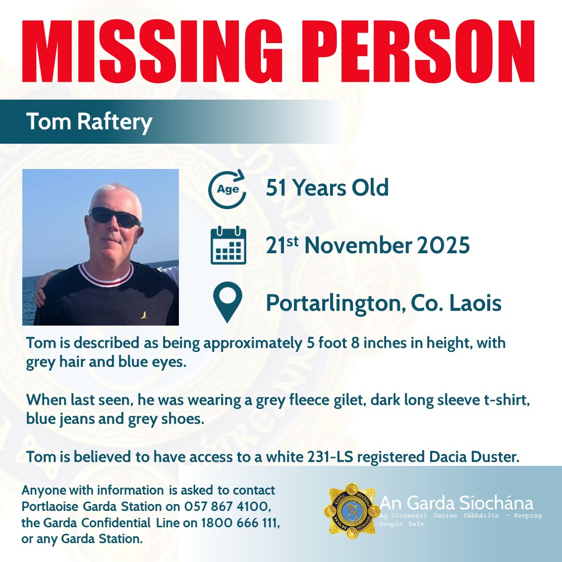 Anyone with information on Tom’s whereabouts is asked to contact Portlaoise Garda Station on 057 867 4100, the Garda Confidential Line on 1800 666 111, or any Garda station.