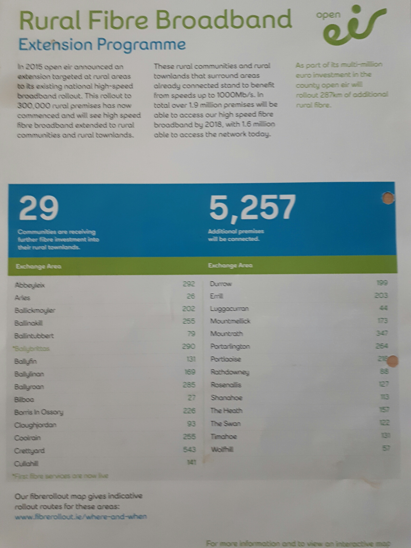 Open Eir is running fibre along its existing telephone poles to connect rural Laois to its network. It is part of a nationwide rollout to 300,000 rural premises. The company says it has already provided fibre to 22k premises in Laois.