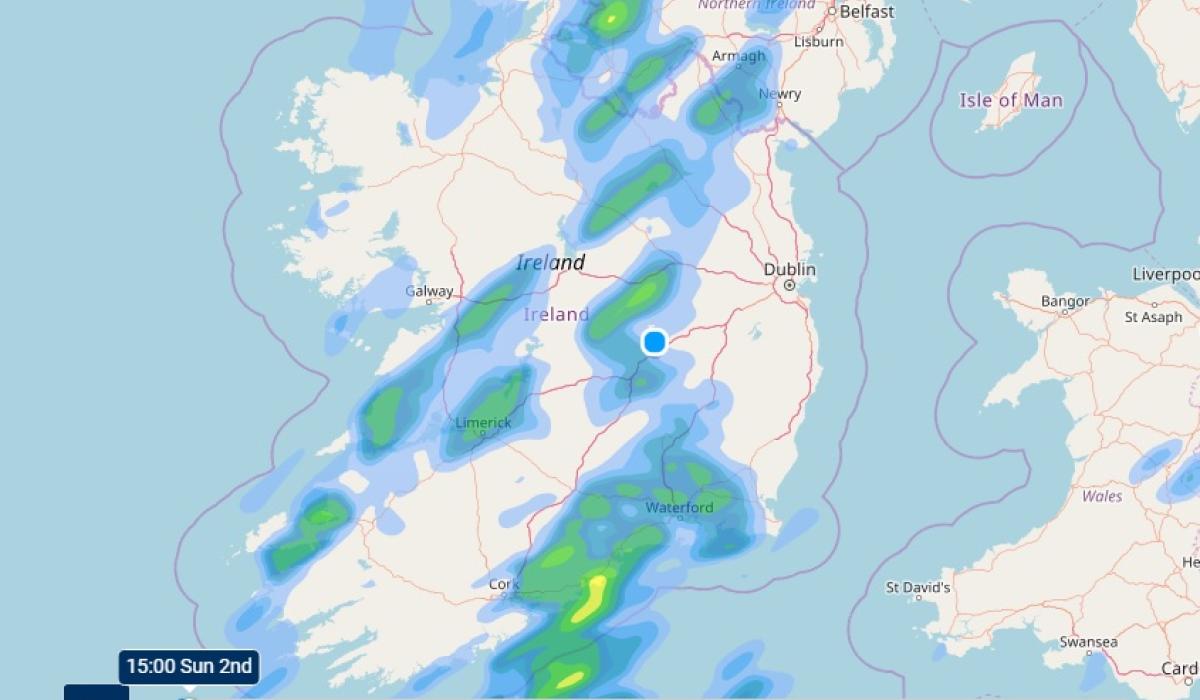Stradbally in Laois basked in warm sunshine on Sunday morning but warns that rain in western coastal counties, will move eastward during the afternoon and evening, but become more scattered.