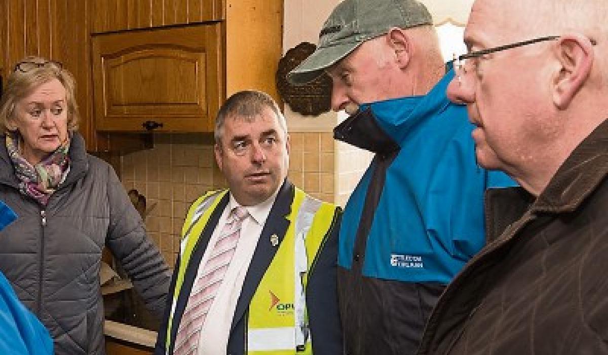 Flood relief Minister Kevin Moran with Cllr Paddy Bracken, Minister Charlie Flanagan and flood victim Anne. Photo Denis Byrne
