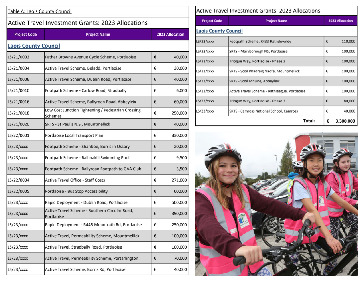 While Portlaoise the main beneficiary of the spending, money is also going to projects in Stradbally, Abbeyleix, Mountmellick, Ballyroan, Ballinakill, Portarlington, Camross and Rathdowney. A number of schools are also getting money for Safe Routes to School.