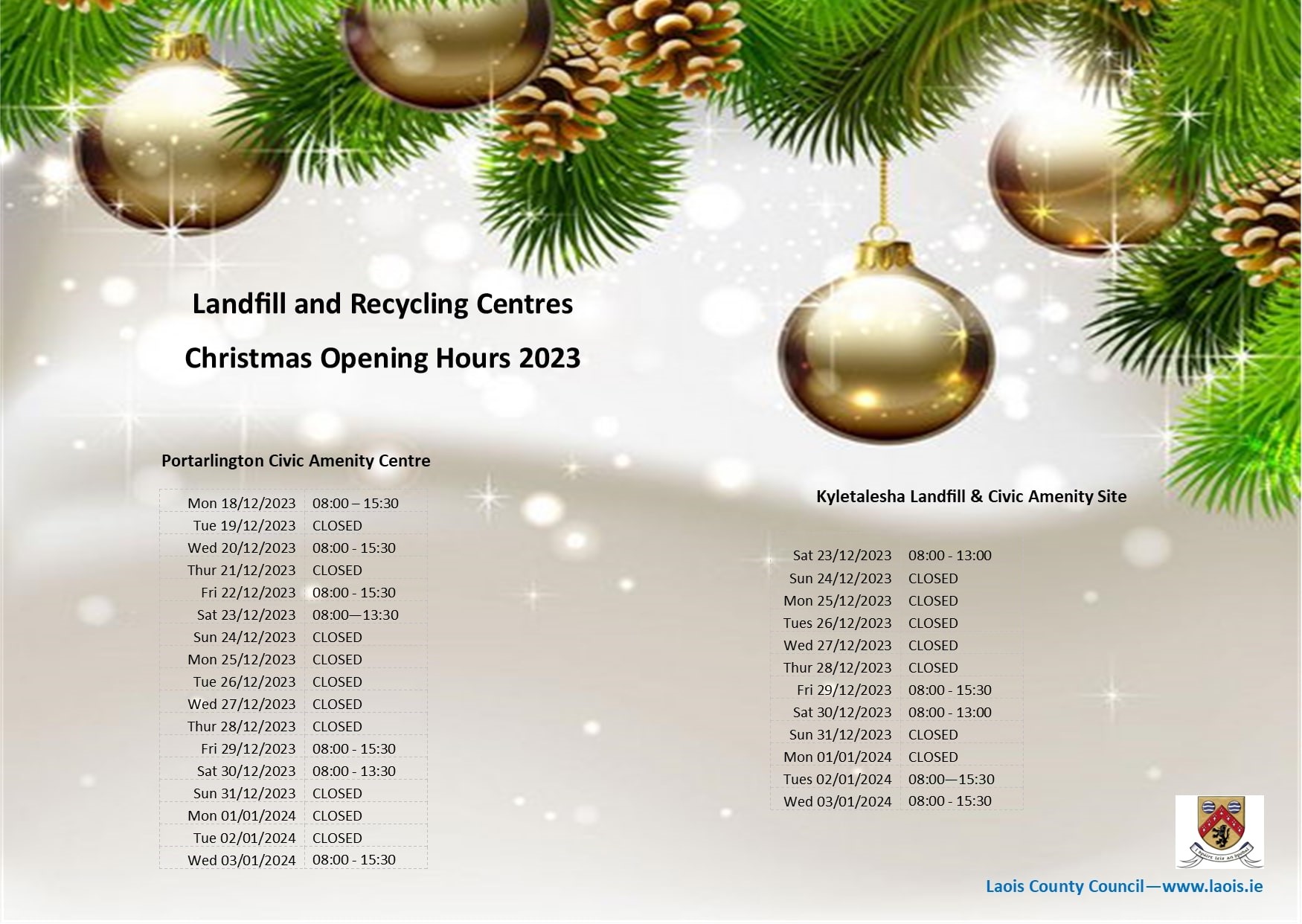 Details of the opening hours over the Christmas Period for Kyletalesha Landfill and Portarlington Civic Amenity Centre were published on the council’s website.