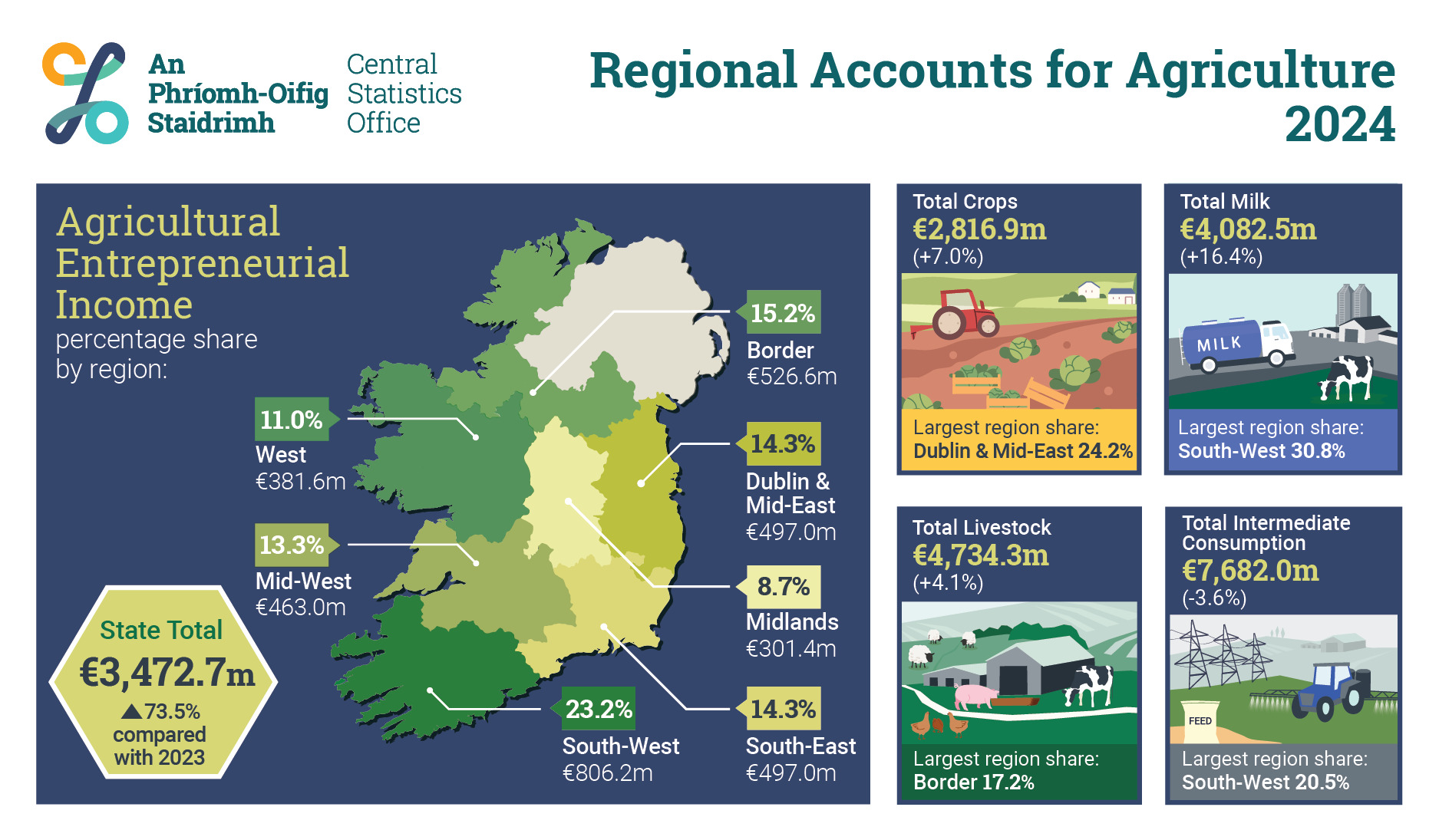 "The Midland region, the second smallest agricultural producing region by output value, saw the value of its agricultural output increase by 11% (+€129m) and its Entrepreneurial Income rise by 111% (+€159m) in 2024," it says.