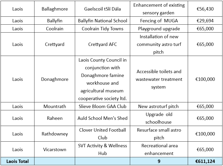 The funding went to projects in Ballyfin, Crettyard, Rathdowney, Mountrath, Raheen, Coolrain, Ballaghmore, Donaghmore and Vicarstown.
