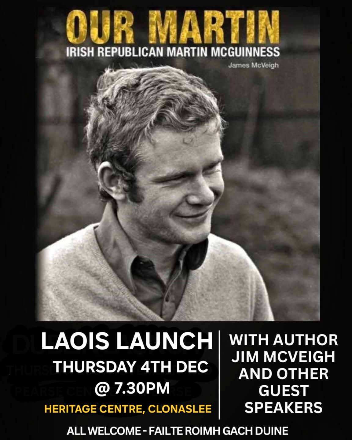 Speaking ahead of the launch, Laois Sinn Féin Cathaoirleach, Aaron Kelly, said: "The event is open to all, and attendees are warmly invited to participate in what will be both a literary and community occasion. The book explores the life and legacy of Martin McGuinness and is a powerful story of political struggle and personal conviction."