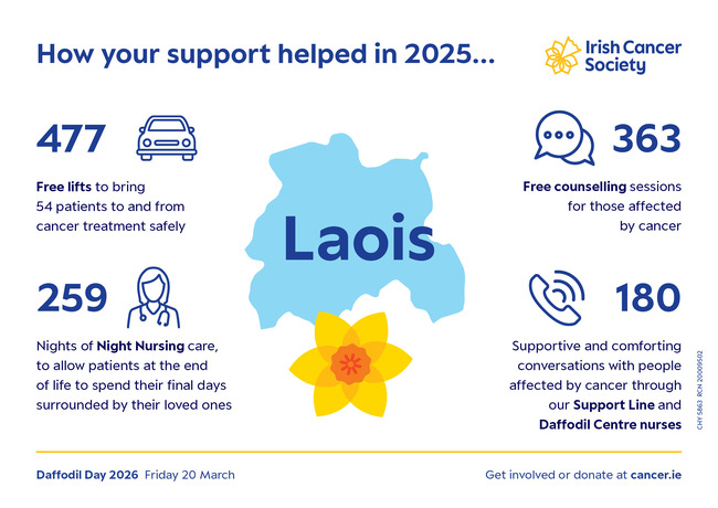 Last year alone, the Irish Cancer Society provided over 470 free lifts to bring local cancer patients in Laois to their treatment. They also provided over 360 free counselling sessions and their cancer nurses had 180 conversations with people from the county through their Support Line and Daffodil Centres.