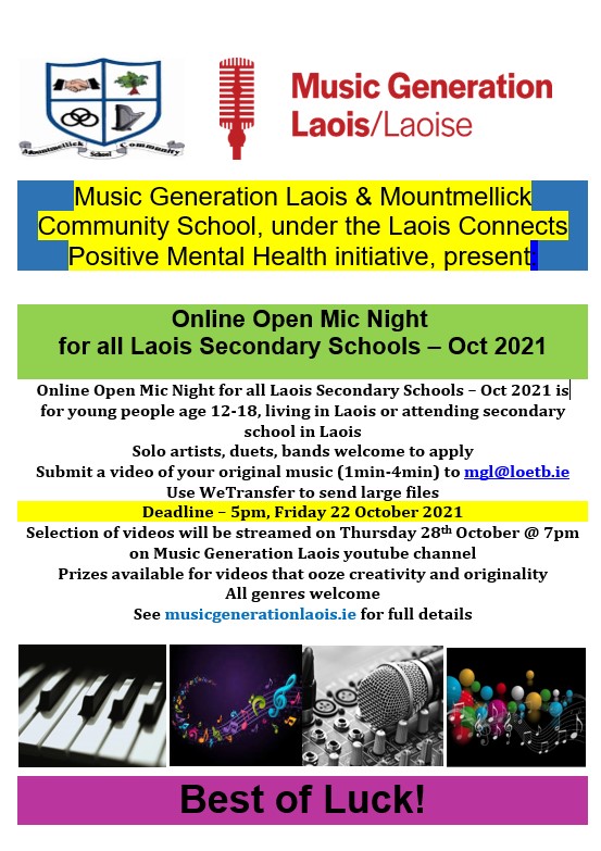 Music Generation Laois is hosting an online open mic night for all young people aged 12 to 18 living in Laois or attending a Laois school this October, as part of Laois Connects mental health month.