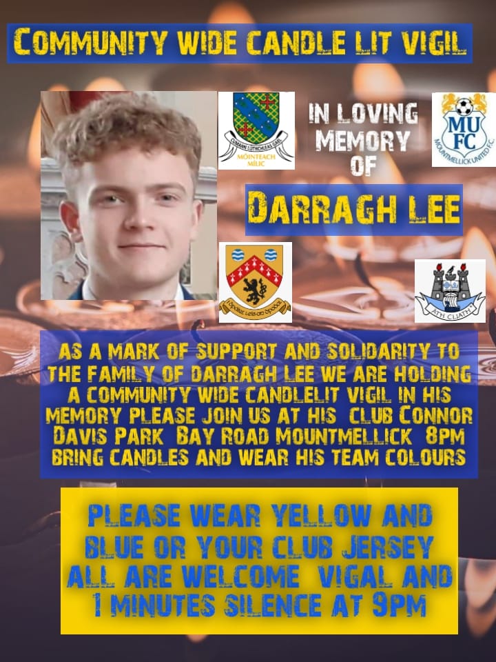 Mountmellick United FC and the Mountmellick Central Hub community group will co-host a vigil for Daragh Lee, a teenage player who died after being hit by a van while walking on the N80 road between Portlaoise and Mountmellick on Saturday morning November 20.
