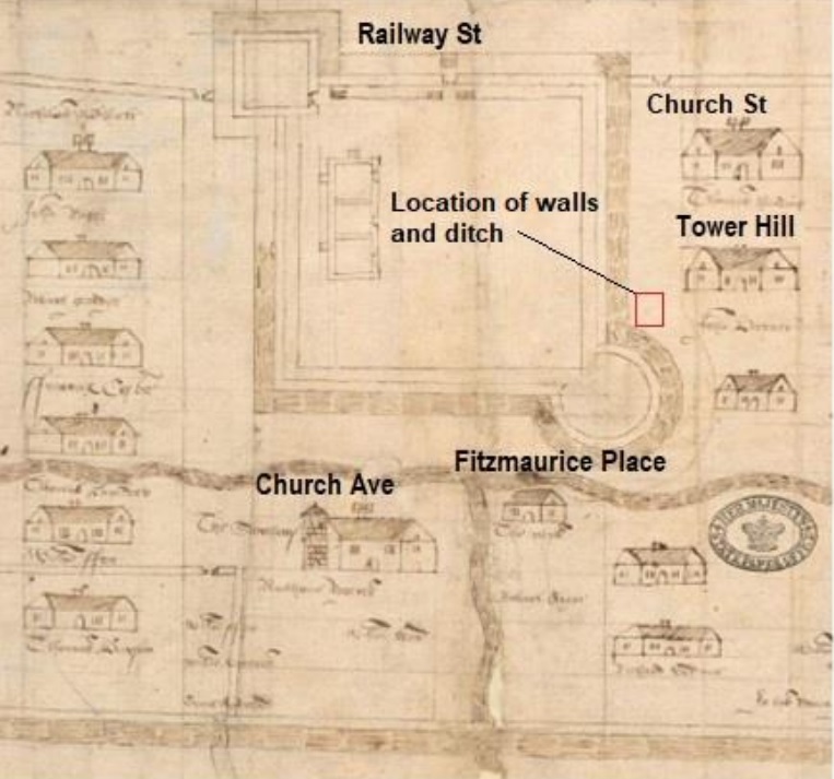 Below: his annoted map of 16th century Portlaoise showing the location of the dig. The map dates to 1560.