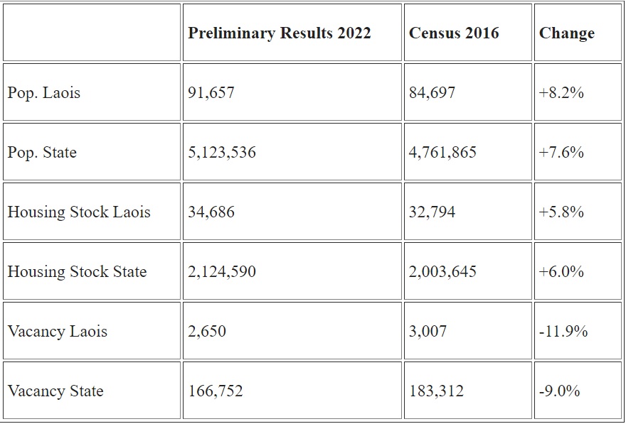 The population of Laois has continued to rise rapidly with the number of people living in the count now over 90,000 with a 30,000 increase in the past 20 years, the first results of Census 2022 reveal.