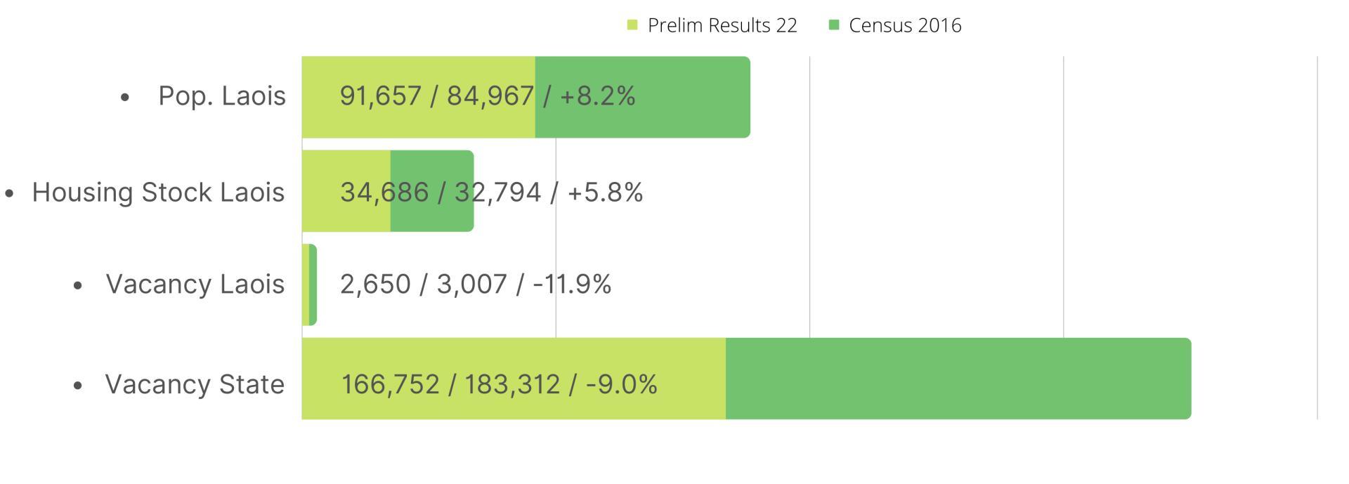 The total housing stock in Laois in April 2022 was 34,686. This shows an increase of 1,892 (+5.8%) since 2016. There were 2,650 vacant dwellings, which was 357 fewer than in 2016 (-11.9%). This does not include holiday homes, of which there were 195.