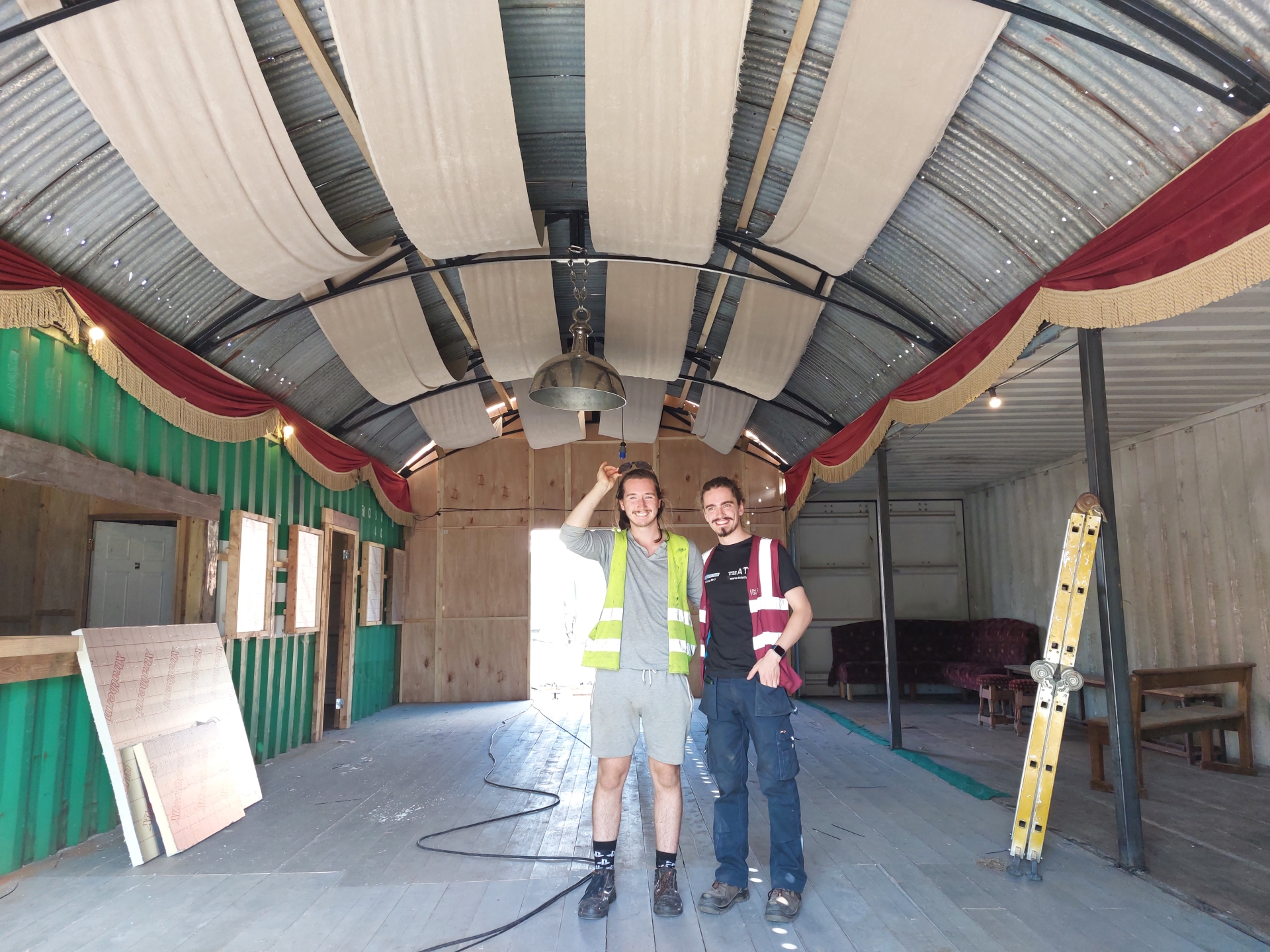 Below: Senan (right) with Darragh Grufferty from Kilmead busy constructing the interior of the Ceilí House.