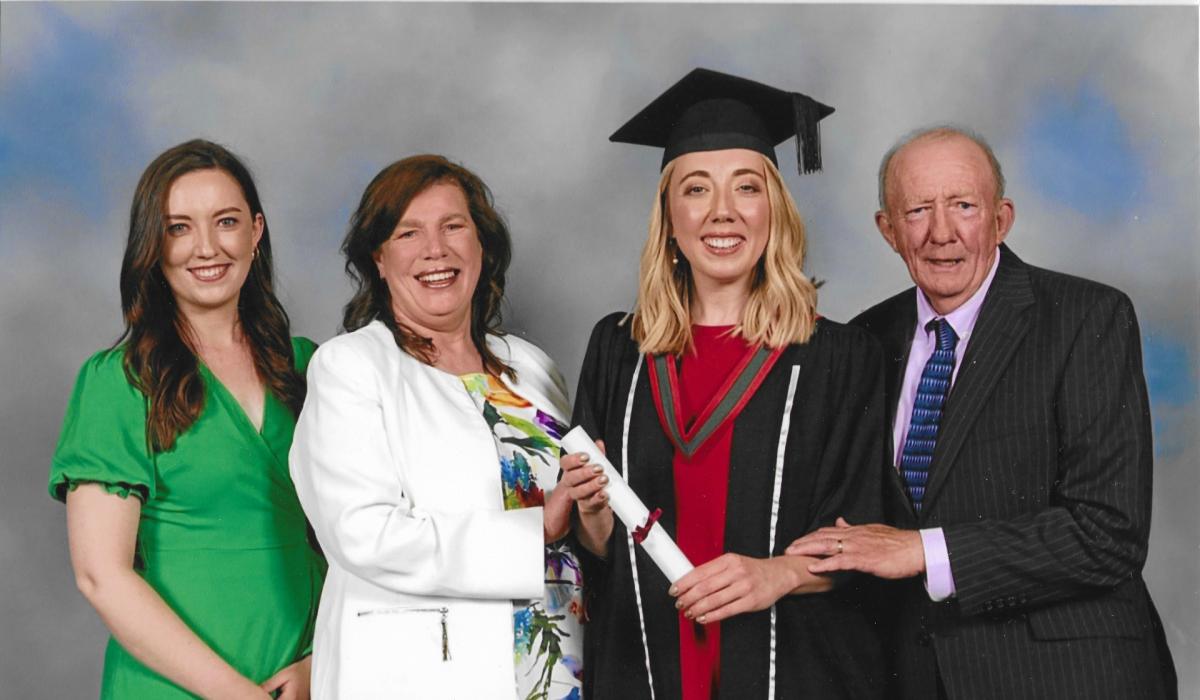 Dr Evelyn Flynn on her graduation day with her parents, mother and Portlaoise native Dolores (nee Connolly) with husband Michael and daughter Niamh