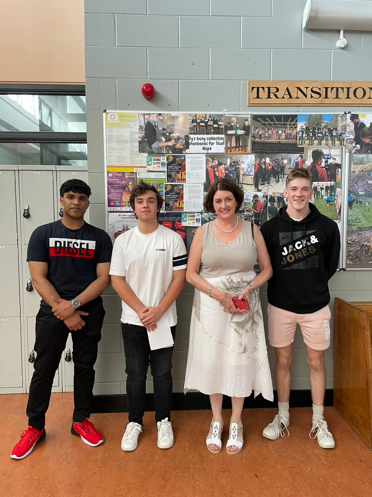 Below: Principal Maura Murphy with Sam Sunni, Marc Bracken and Dara Phelan.