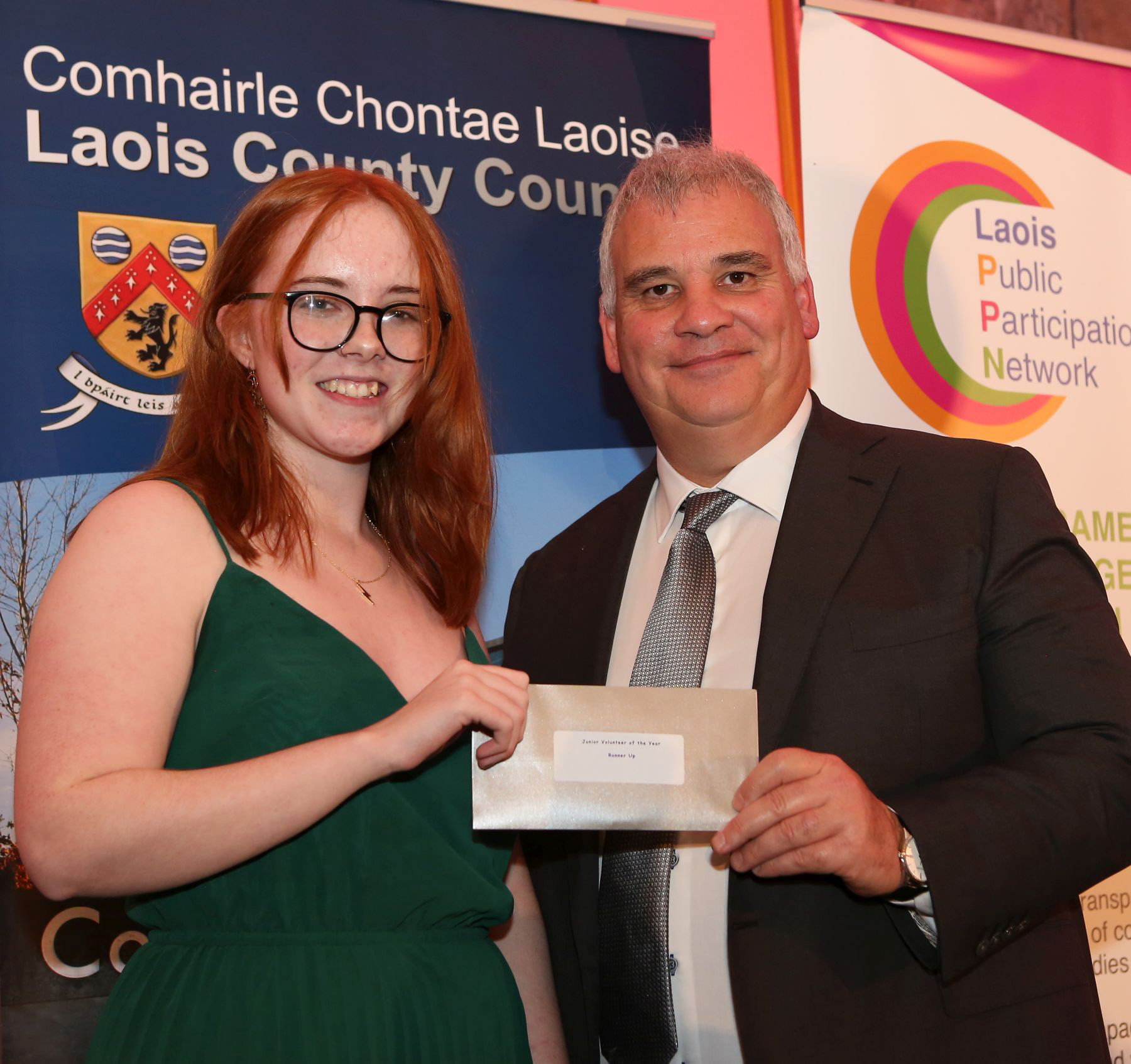 Carly Fagan was presented with the Junior Volunteer Runner's Up Prize by Paddy Buggy of Laois PPN.