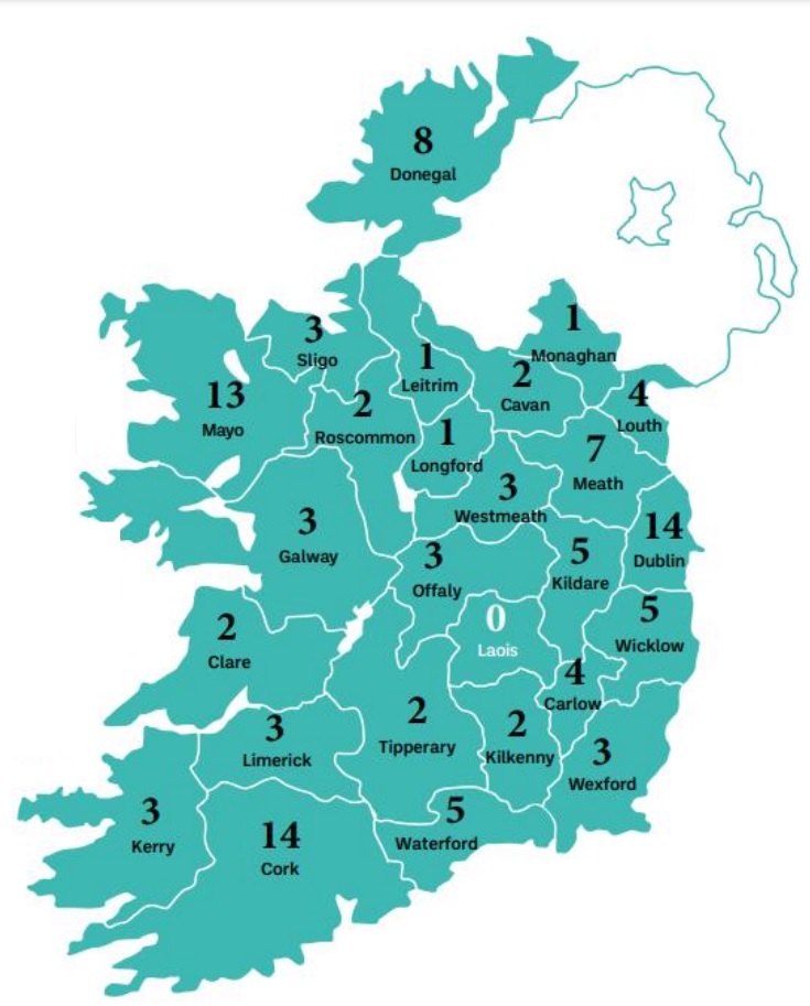 The highest road death rates are in Dublin and Cork with 14 deaths and Mayo with 13, by July 28. Laois had no road deaths.