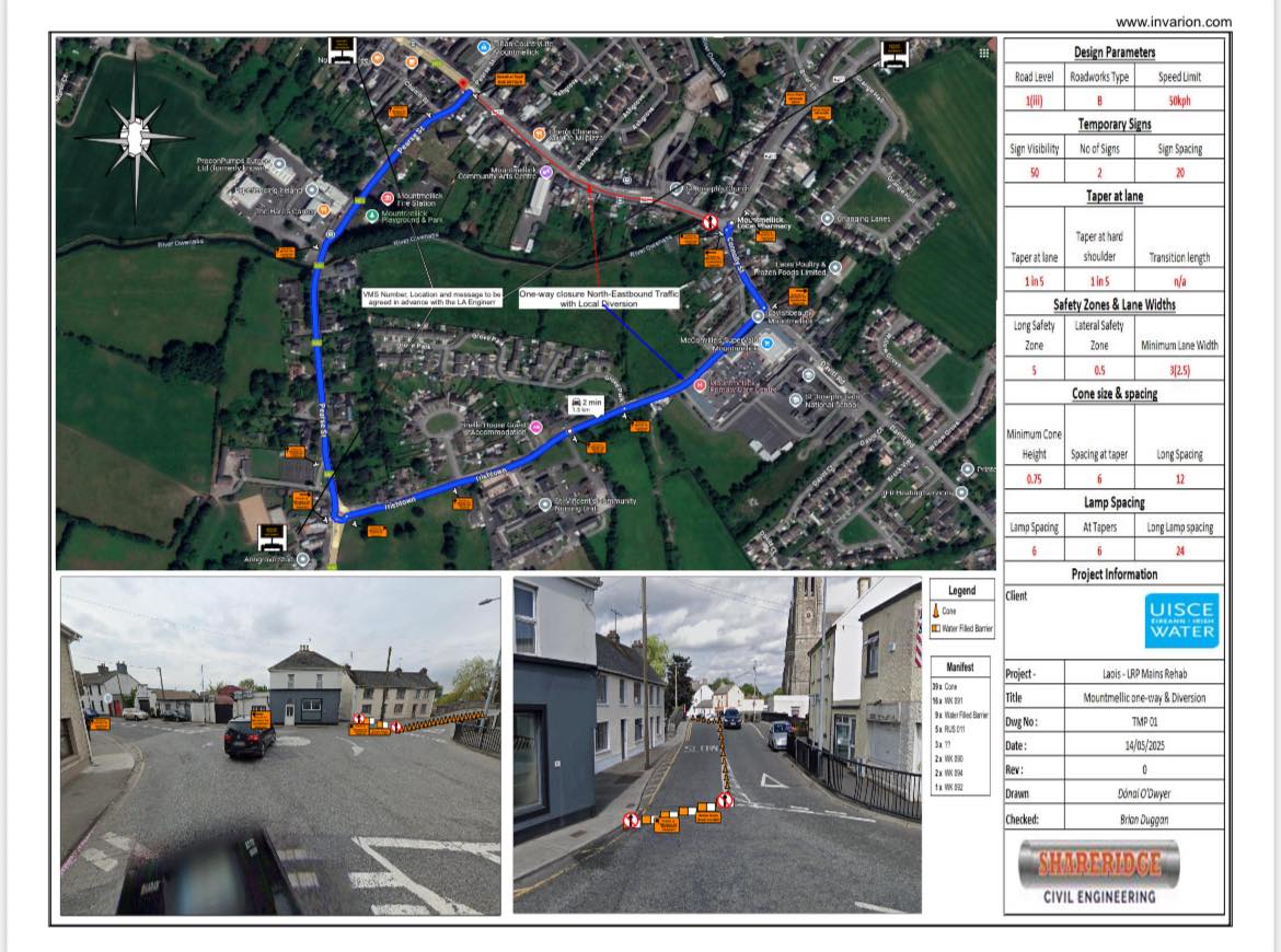 "The proposed Diversion route and outline detail for the one-way closure of Parnell St., Mountmellick on the North Eastbound direction (toward Tullamore). These works are expected to take 4 to 6 weeks, all going well, and the lane would be closed for about 4 weeks of that time, starting on the 9th June (subject to change)”.