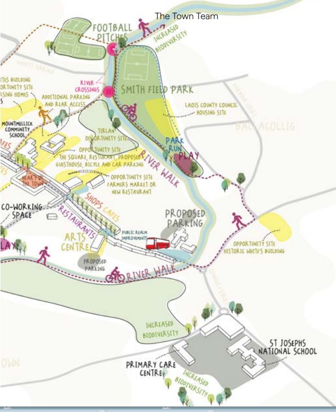 Led by local suggestions, the consultants have targeted six priority areas in Mountmellick town centre; O’Connell Square, Smiths Field Park, the public realm, a continuous River Walk right through the town, Revitalisation of the town centre and as a Trail Head to the Slieve Blooms.