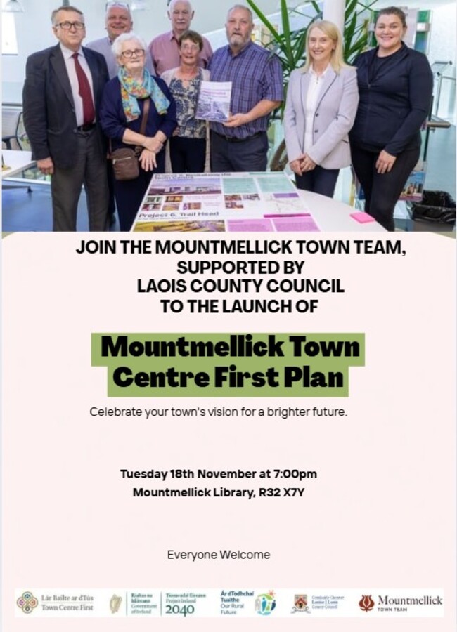 Laois County Council will be launching the Town Centre First Plan at Mountmellick Library at 7pm on Tuesday, November 18.