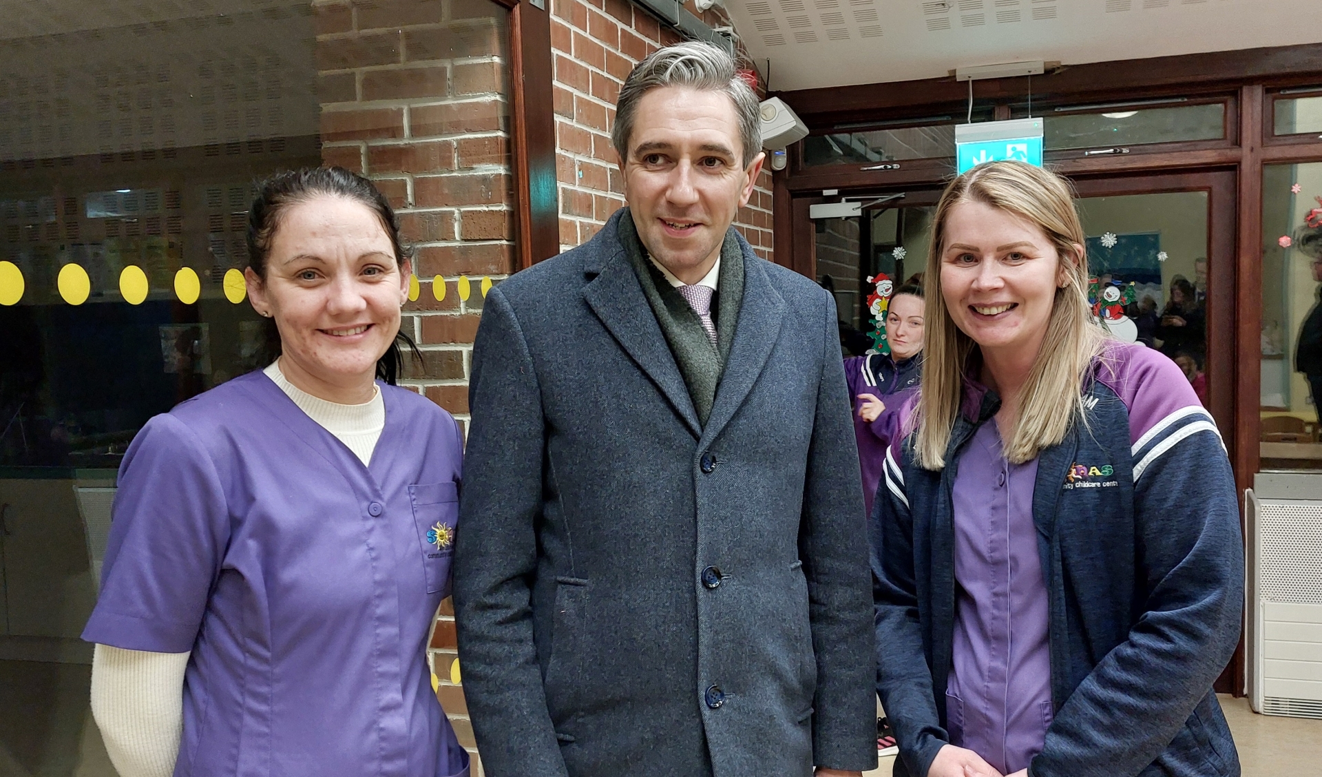 Then Taoiseach Simon Harris visiting Sonas childcare centre in Mountmellick ahead of the 2024 General Election. Photo: Leinster Express