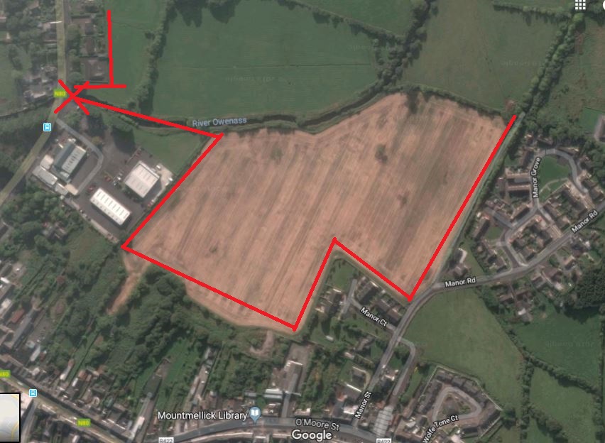 The red X is where the defence wall is planned to begin at the bridge over the Owenass River at the N80 in Irishtown.
