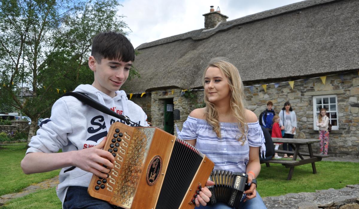 Conor and Caoimhe entertaining visitors at last year’s fleadh in Camross; Outdoor sessions are a feature of the fleadh.