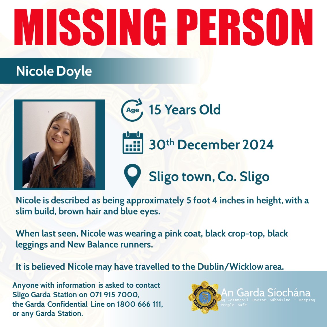 Gardaí are seeking the public's assistance in tracing the whereabouts of 15-year-old Nicole Doyle , who was reported missing in Sligo town on Monday, December 30.