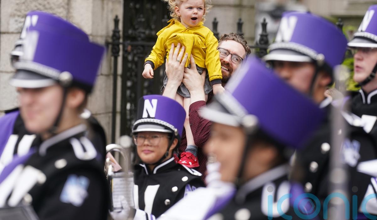 Taoiseach Micheal Martin and Dublin Mayor Caroline Conroy greeted a US marching band and cheerleaders ahead of an American football game in Dublin this weekend.