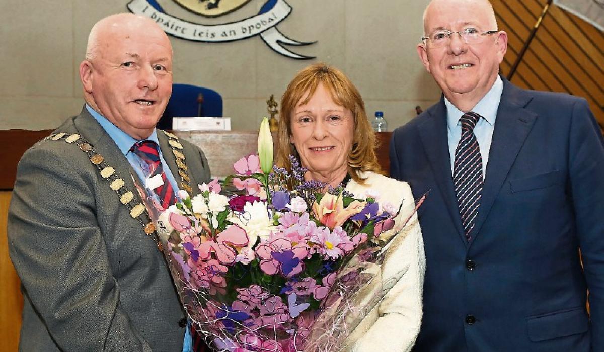 Former Laois County Council Cathaoirleach Tom Mulhall with Mary Flanagan and husband Minister Charlie Flanagan. Pic: Michael Scully