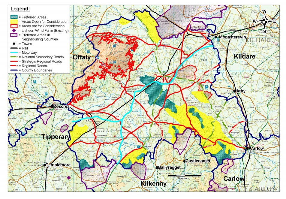 The area is marked as 'open for consideration' on the Laois wind map in Laois County Council's development plan (yellow strip in top centre of map below).