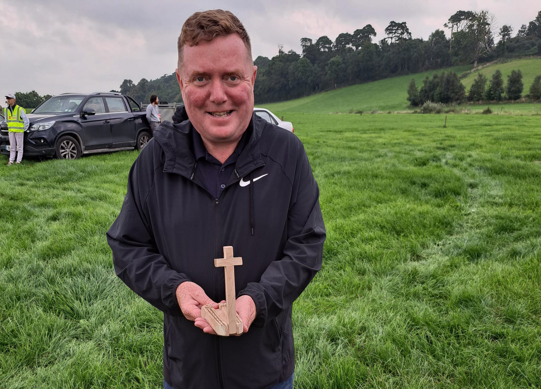 Pictured: Father Paddy Byrne with a portable wooden Penal Cross, used during the 17th and 18th centuries in Mass Fields such as Clonkeen. Photo: James G Carroll