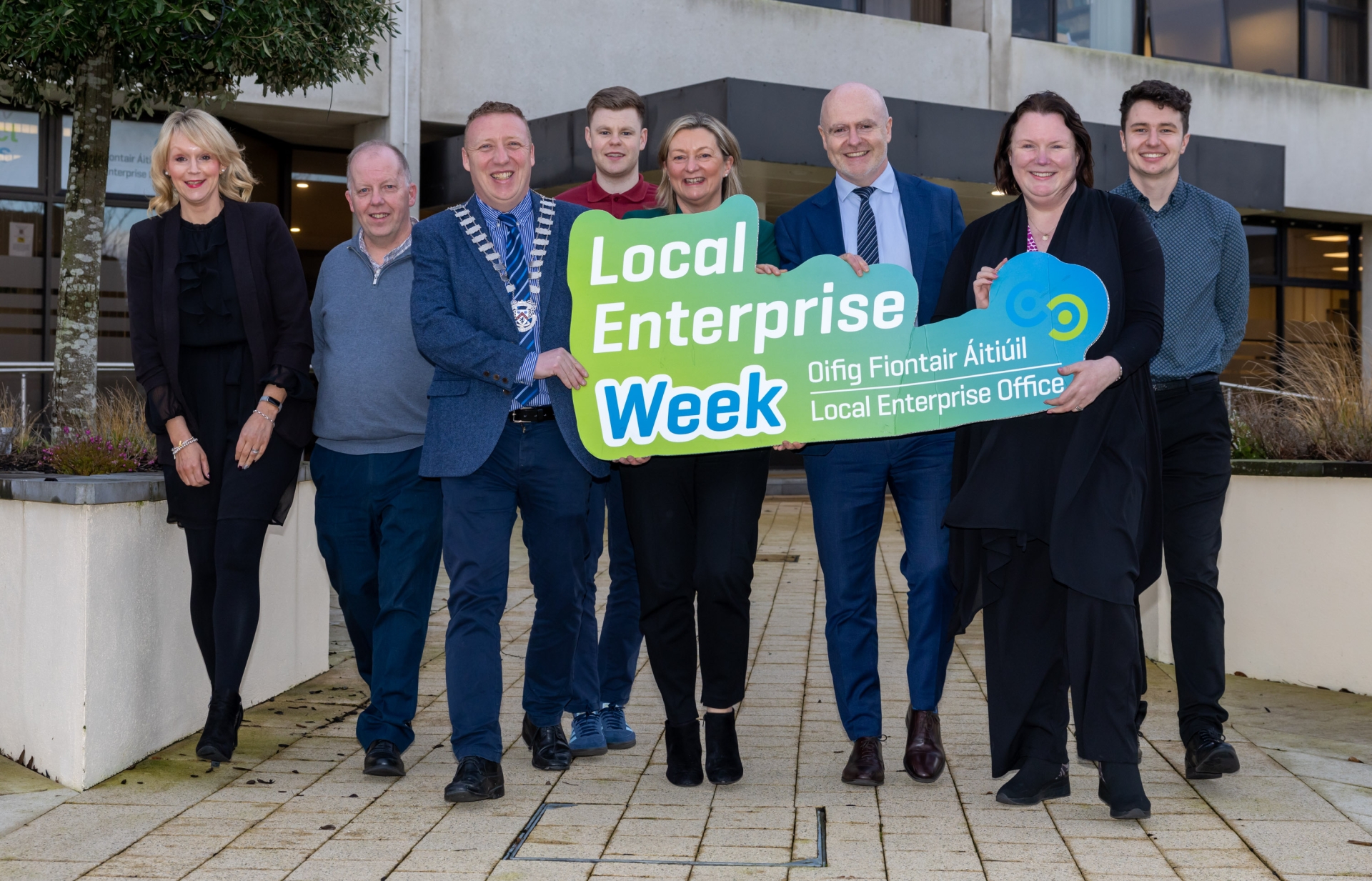 Cllr Barry Walsh, Cathaoirleach of LCC; Michael Rainey, Chief Executive LCC and Angela McEvoy, Director of Services LCC with the LEO Laois team of Linda Meredith, Dom Reddin (acting Head of Enterprise); Jason Maher, Honor Deevy and Gearoid Sheridan at the launch of Local Enterprise Week 2026 run by Local Enterprise Office Laois and taking place from March 2nd to March 6th. Photo: Alf Harvey.