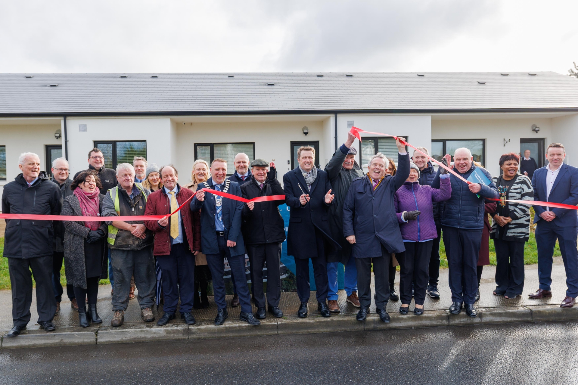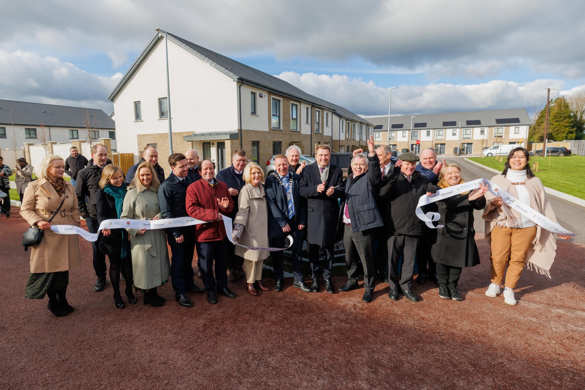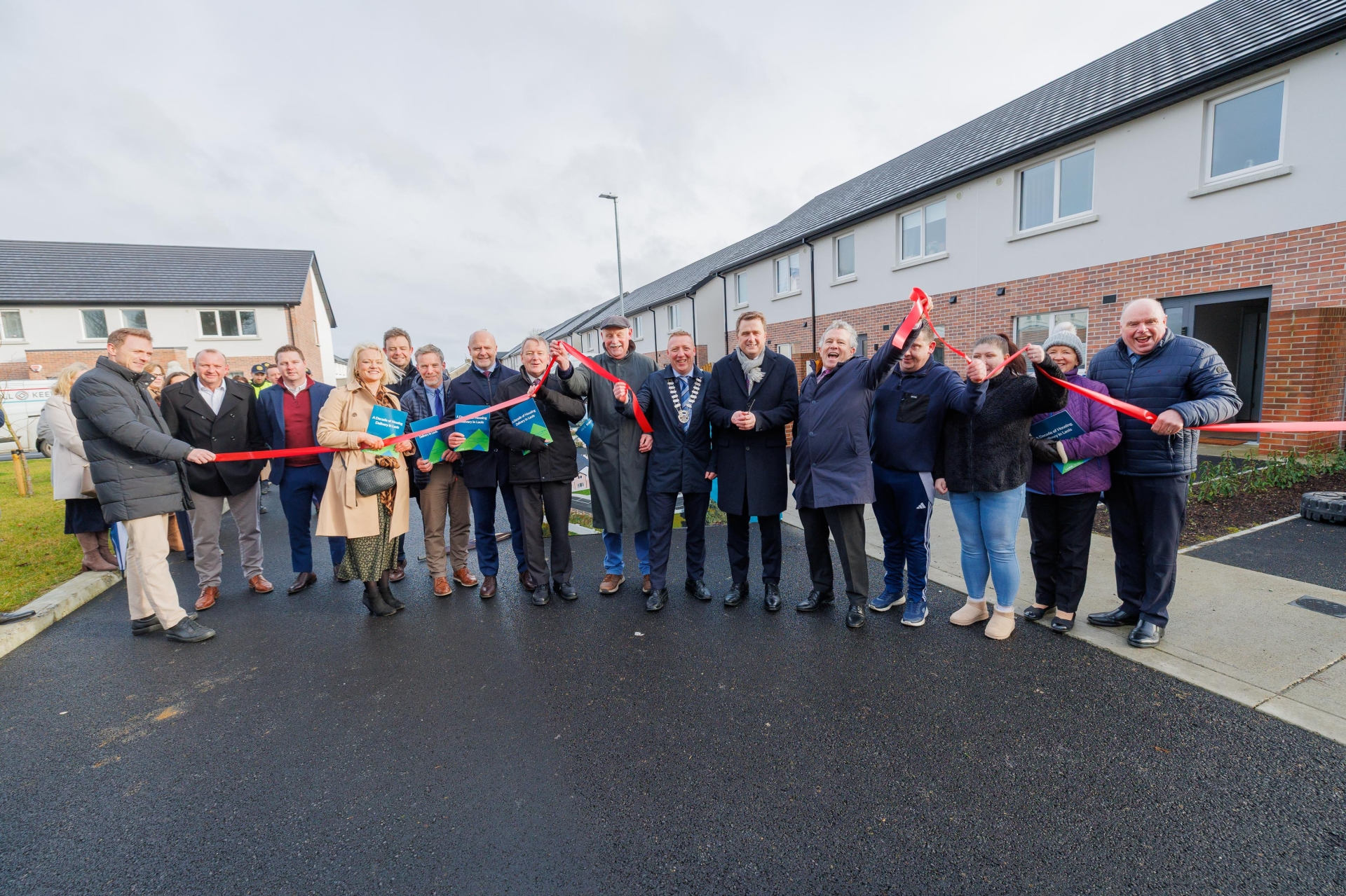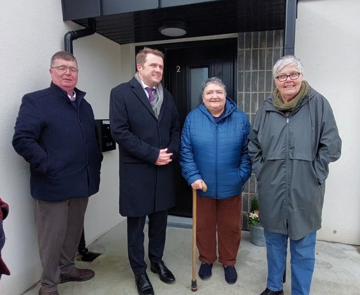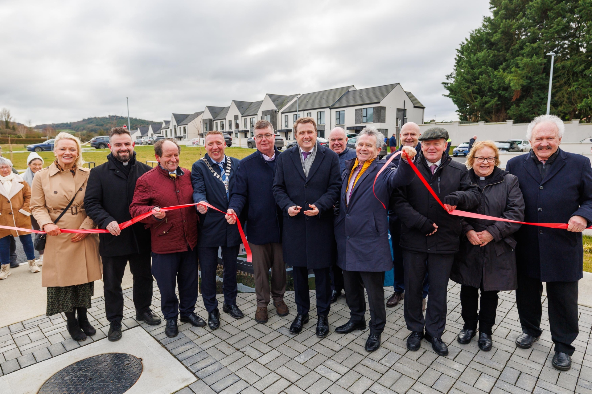 Minister for Housing, Local Government and Heritage James Browne visited four new Laois social housing estates totalling 164 homes last Friday, February 13, meeting residents, cutting ribbons and praising Laois County Council as a local authority that ”stands out and delivers when it comes to social housing”.