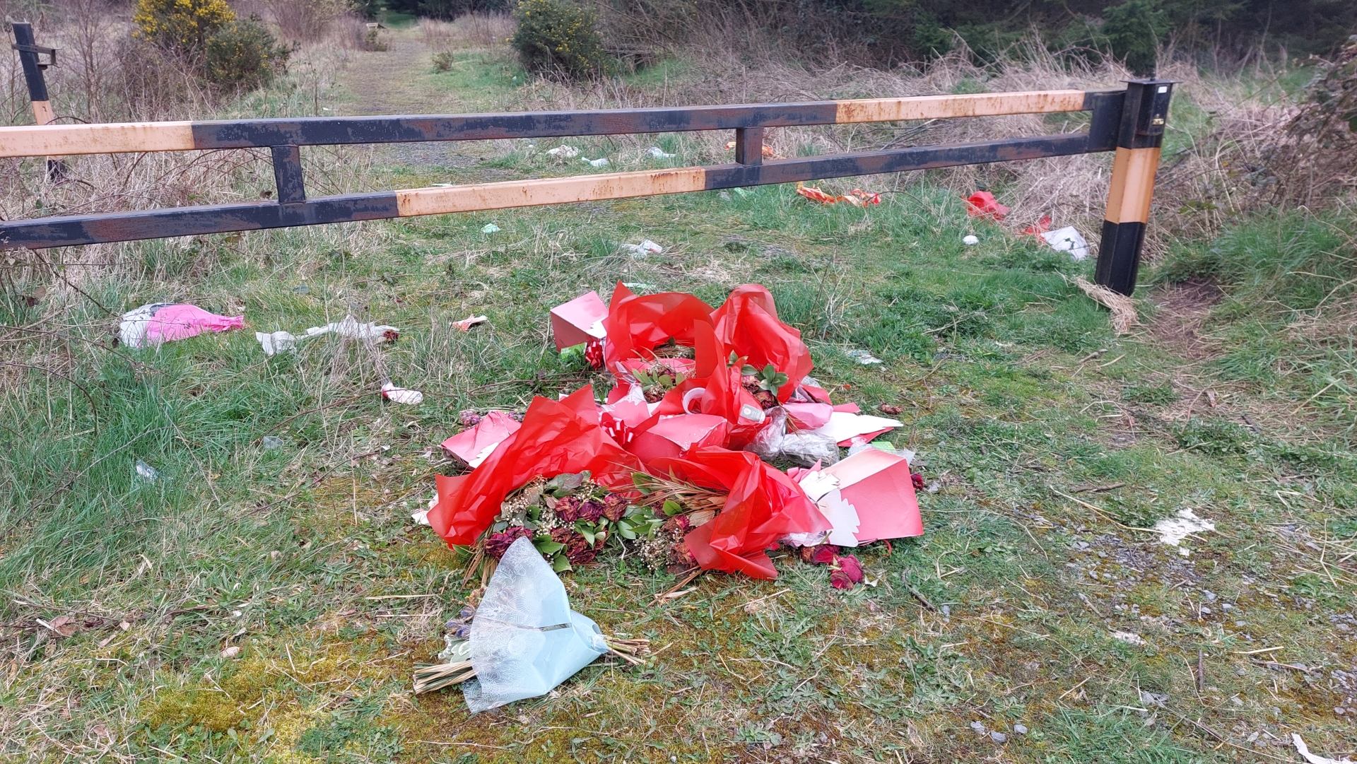 Over a dozen flower bouquets in plastic littering Portlaoise woodland entrance