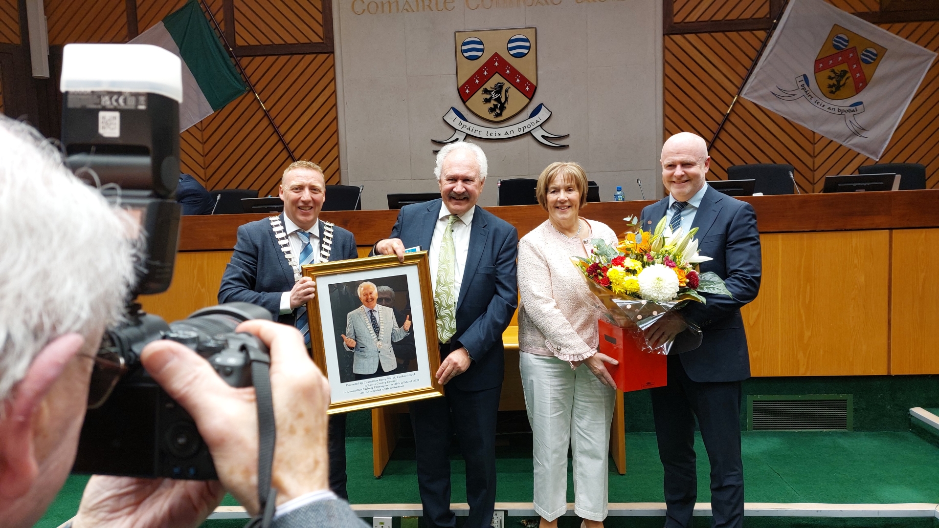 Cllr Fleming and his wife Catherine receiving gifts from Laois County County Cathaoirleach Cllr Barry Walsh, and CEO Michael Rainey, with picture being taken by Laois photographer Michael Scully.