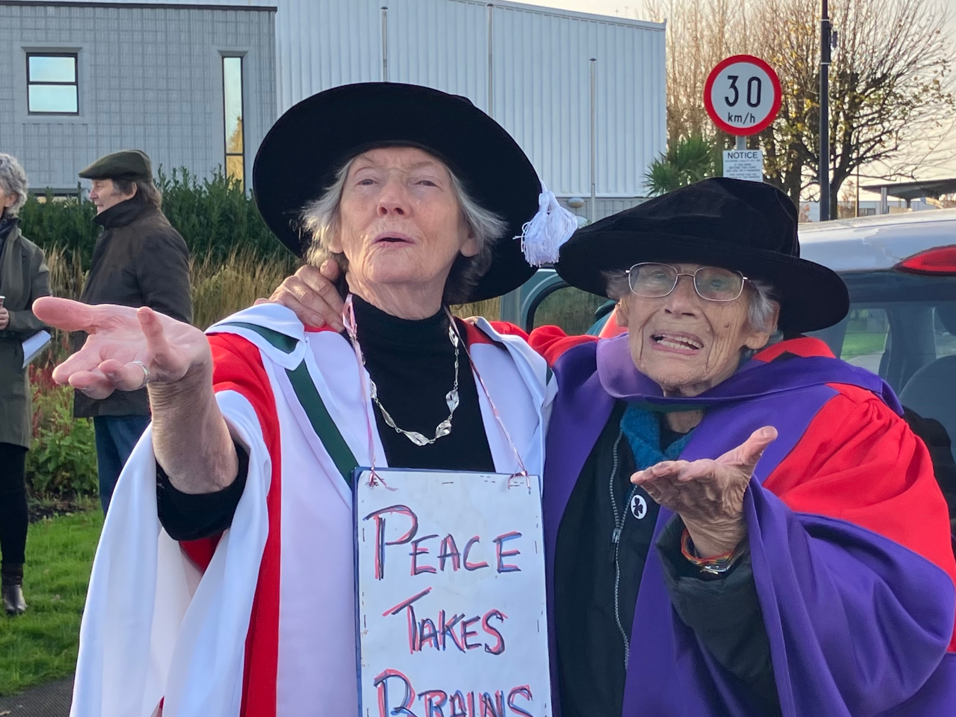 Lelia Doolan with her friend and fellow social justice activist Margaretta D’Arcy when they were honoured with doctoracts from Galway University. They later both returned them in protest at Israeli links to the university.