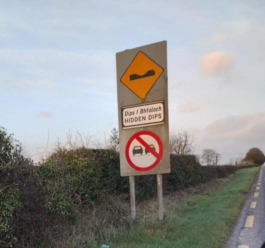 He said also that the Irish translation used on the roadsigns warning for "hidden dips" as "dips I bhfolach" is also wrong.